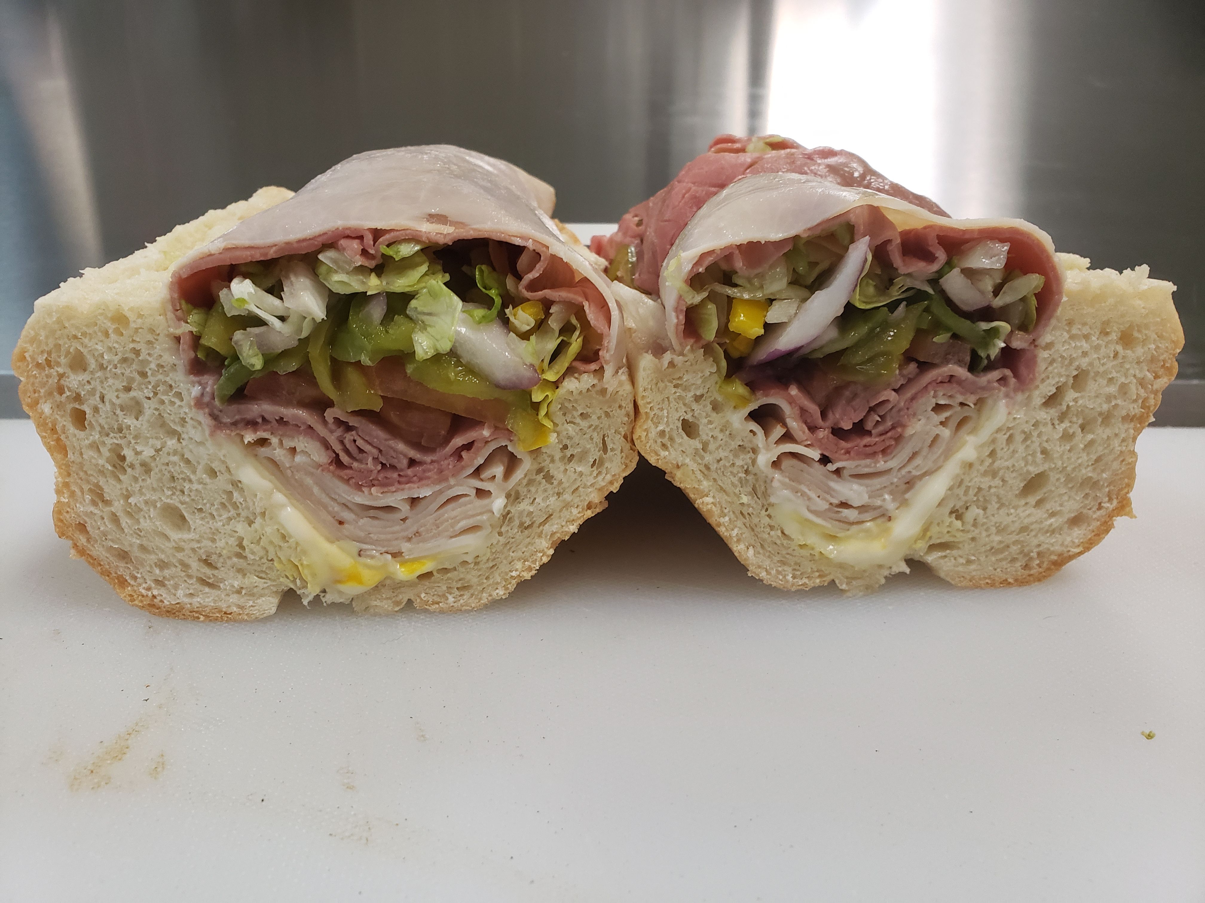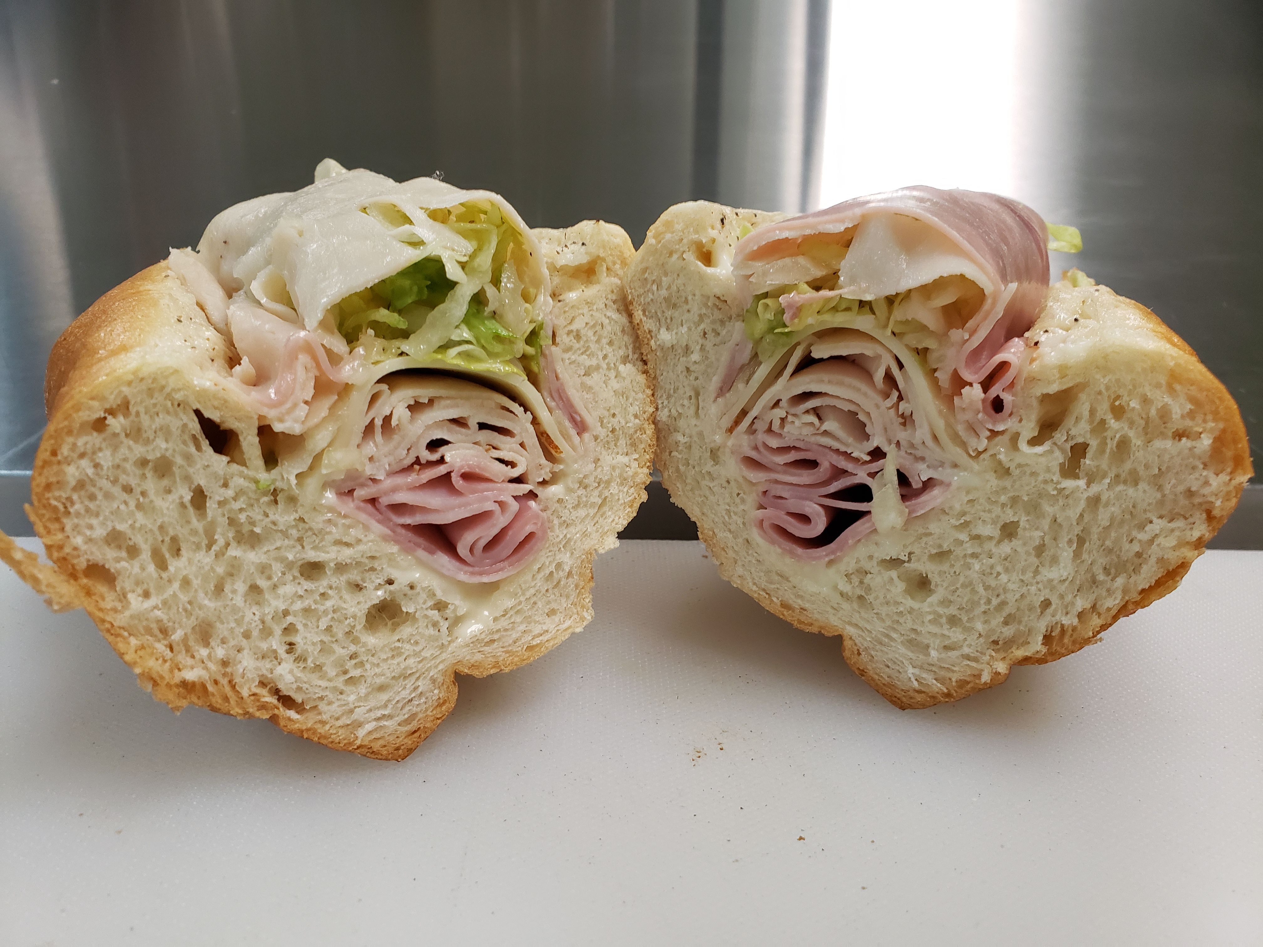 Ham, Turkey, Bacon, and cheddar cheese pressed on Cuban bread on our panini press then we add mayo, lettuce, tomato