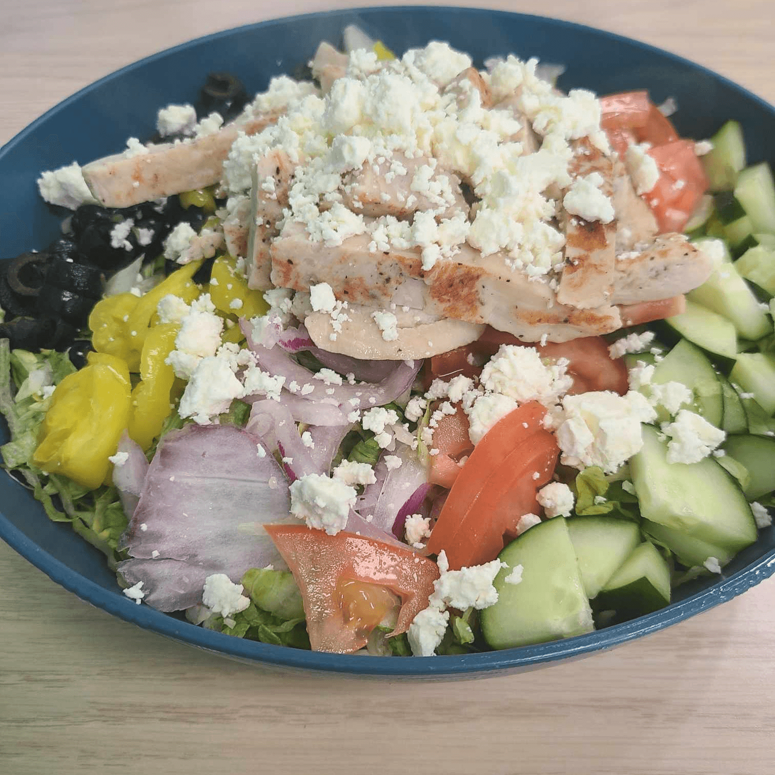 Shredded Iceberg Lettuce, Red Onion, Diced Tomato, Banana Peppers, Chopped Cucumbers, Black Olives, and Feta cheese crumbles. Add Chicken or Gyro meat for some protein.