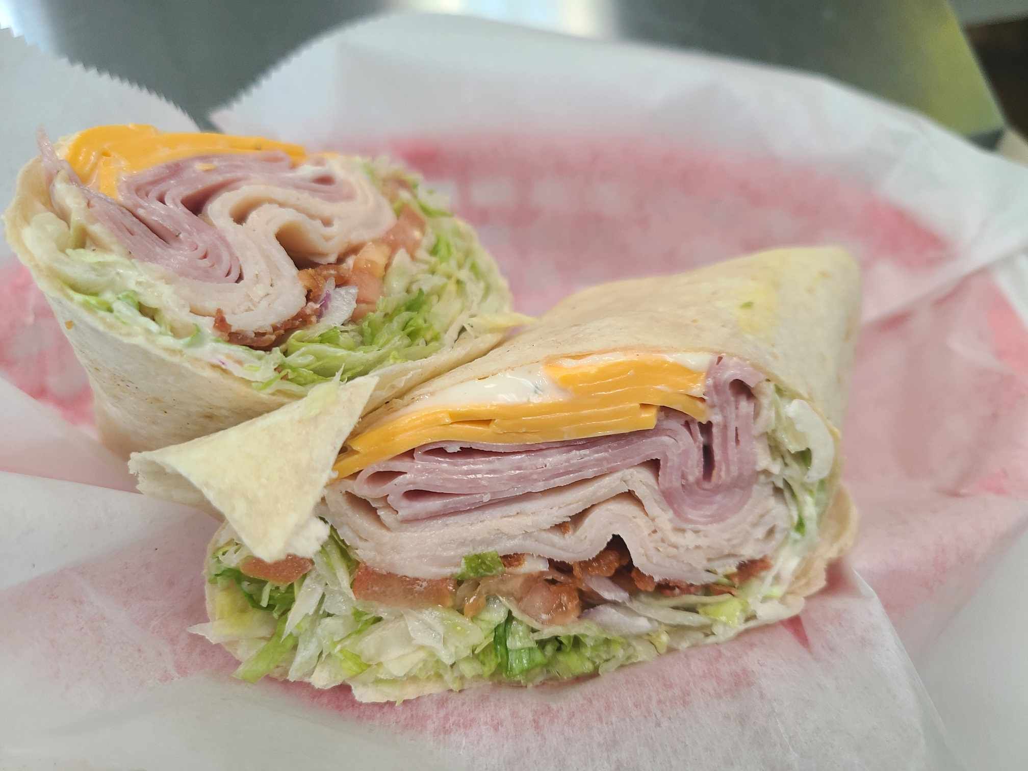 Ham, Turkey, Bacon, Mayo, Lettuce, Tomato, and Cheddar Cheese in your wrap of choice