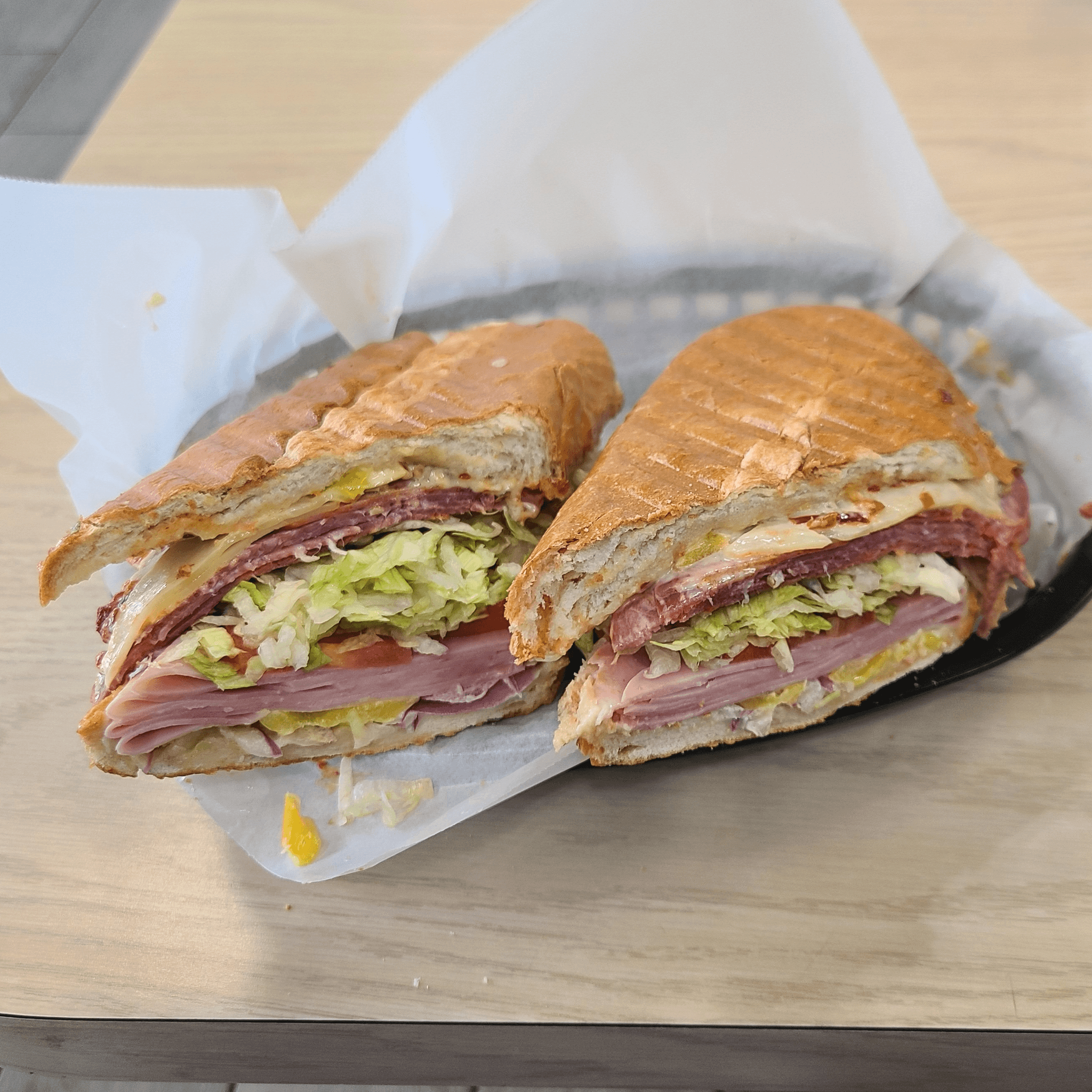 Ham, Cappy, Salami, and Provolone cheese pressed on Cuban bread on our Panini press